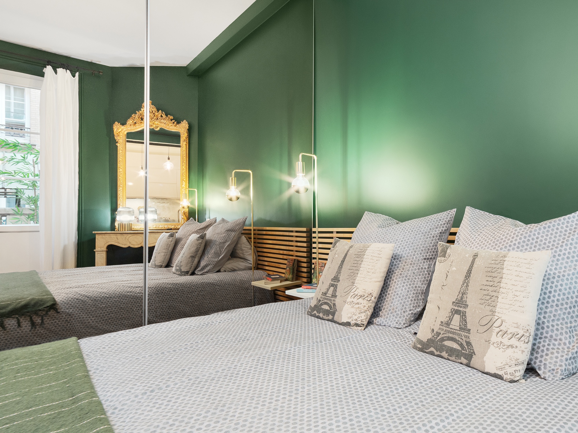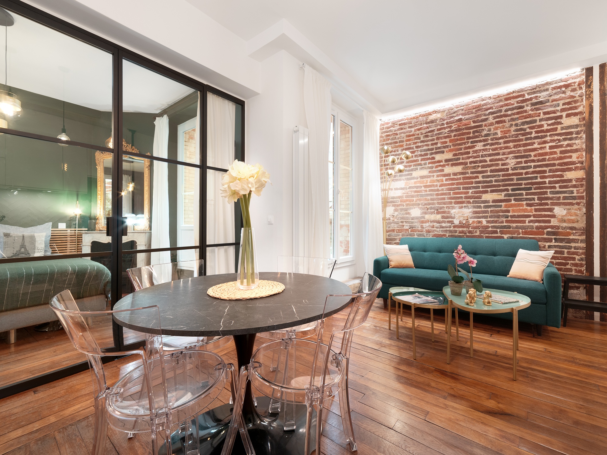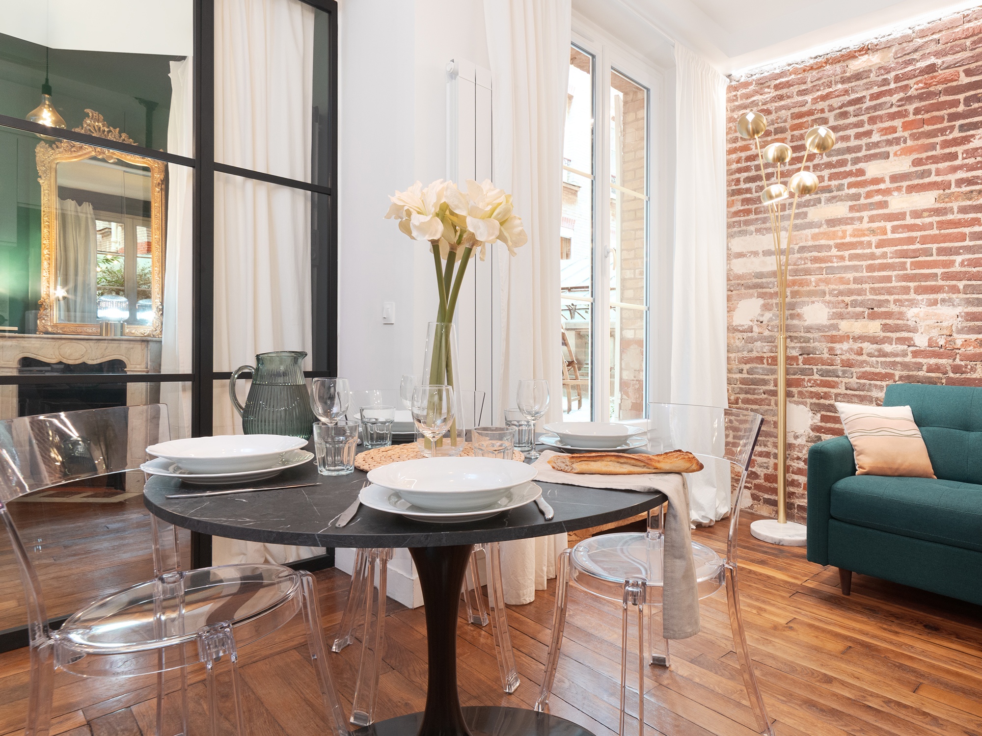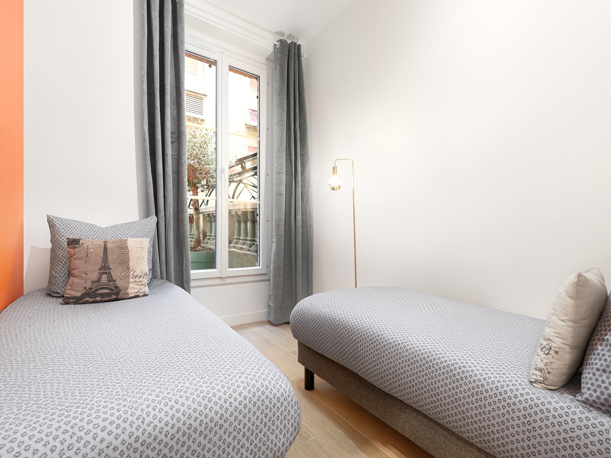Cet appartement meublé d’environ 45 m2 est situé 5, rue Nicolet, dans le 18èmearrondissement juste en dessous de la Butte Montmartre : Il se trouve en rez-de-chaussée surélevé dans un immeuble parisien typique de bon standing accessible et très sécurisé par une porte avec digicode et un SAS en verre avec Vigic. Ses fenêtres donnent sur un patio intérieur qui peut être utilisé par nos hôtes. Ce patio est équipé d’une table et de chaises. Contemporain et design, l’appartement dispose de : une chambre avec un lit queen size de qualité, d’une chambre avec deux lits et d’un vaste salon avec cuisine US, salle de bain et toilette séparé. Il est équipé d’une télévision écran plat et Internet (accès illimité gratuit), de microonde, four, réfrigérateur, lave-vaisselle, plaques de cuisson, machine NESPRESSO et machine à laver. La salle de bain avec douche et double vasque vous ravira par son design. Les serviettes et draps sont fournis. *Prix sur demande en fonction de la saison et de l’occupation