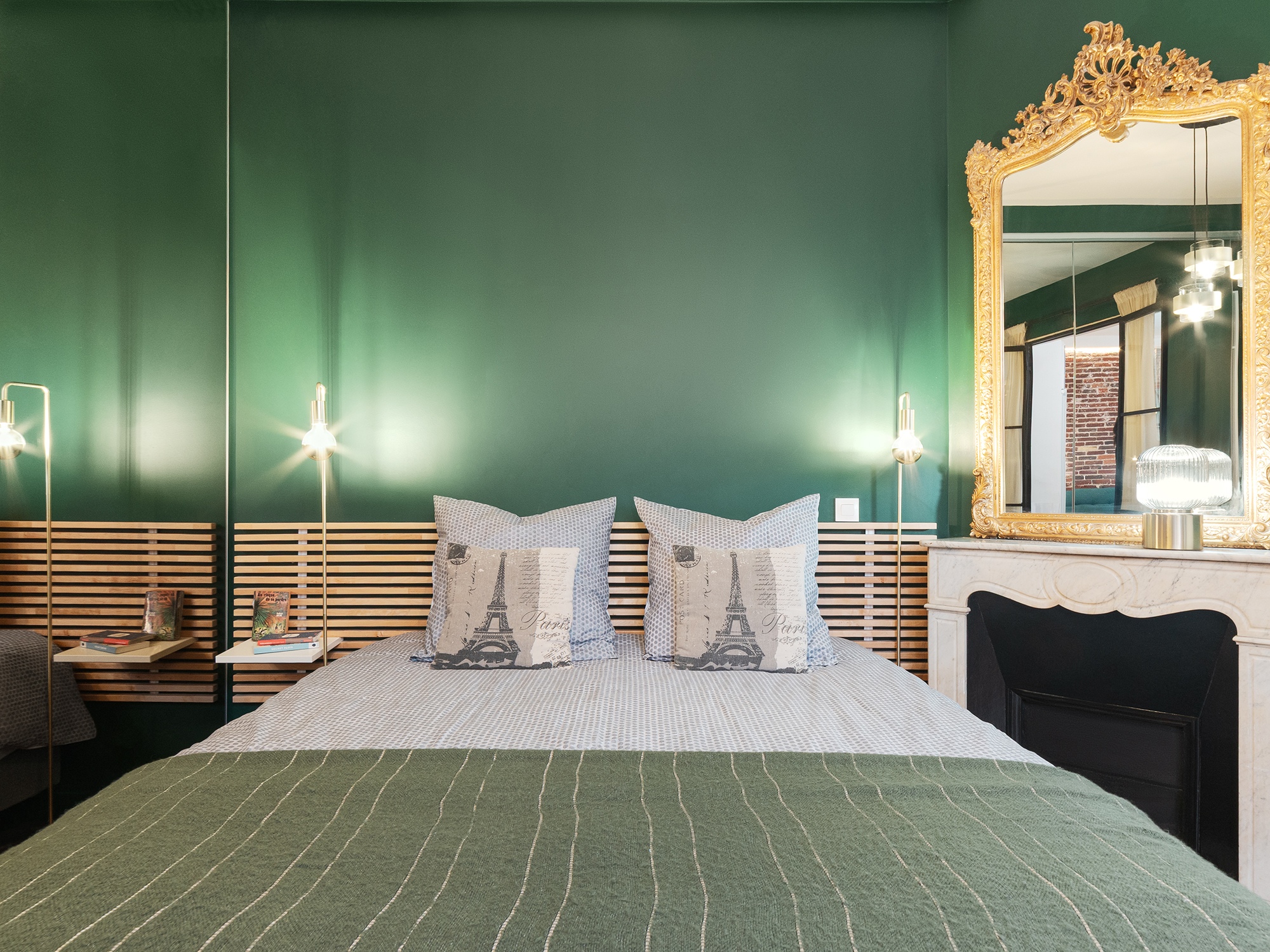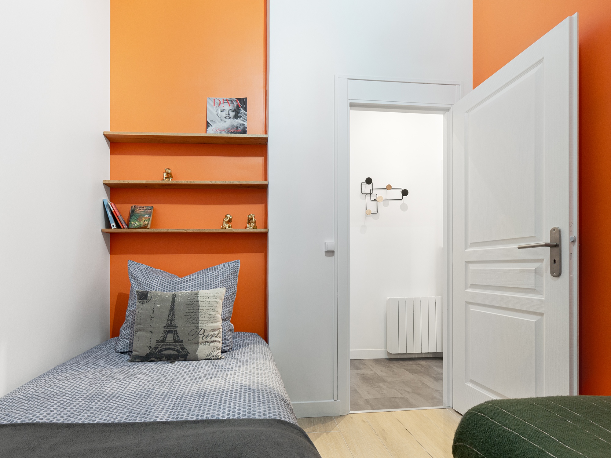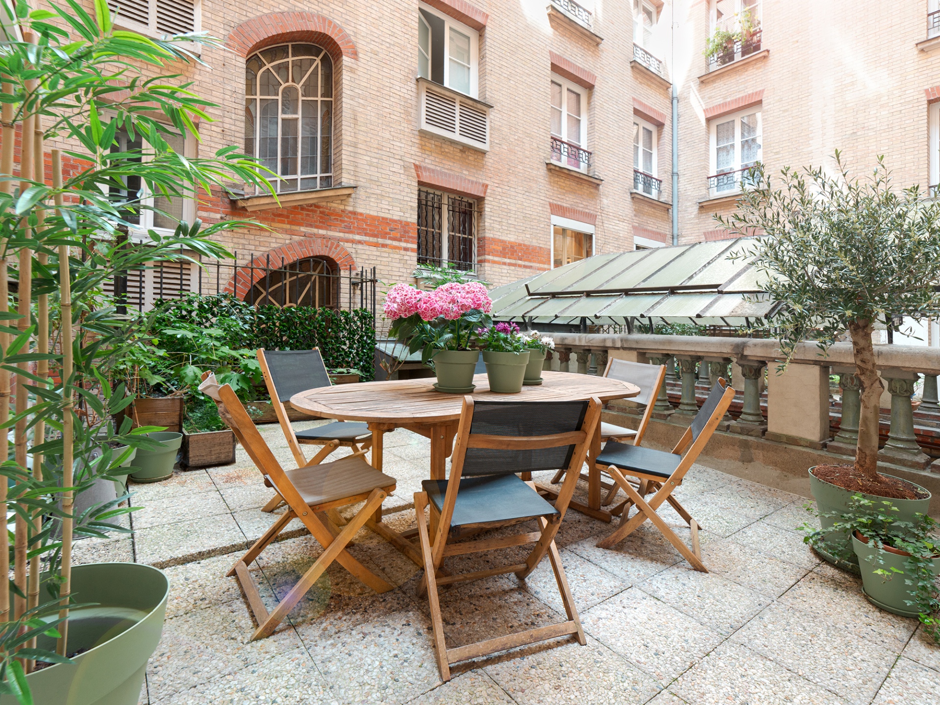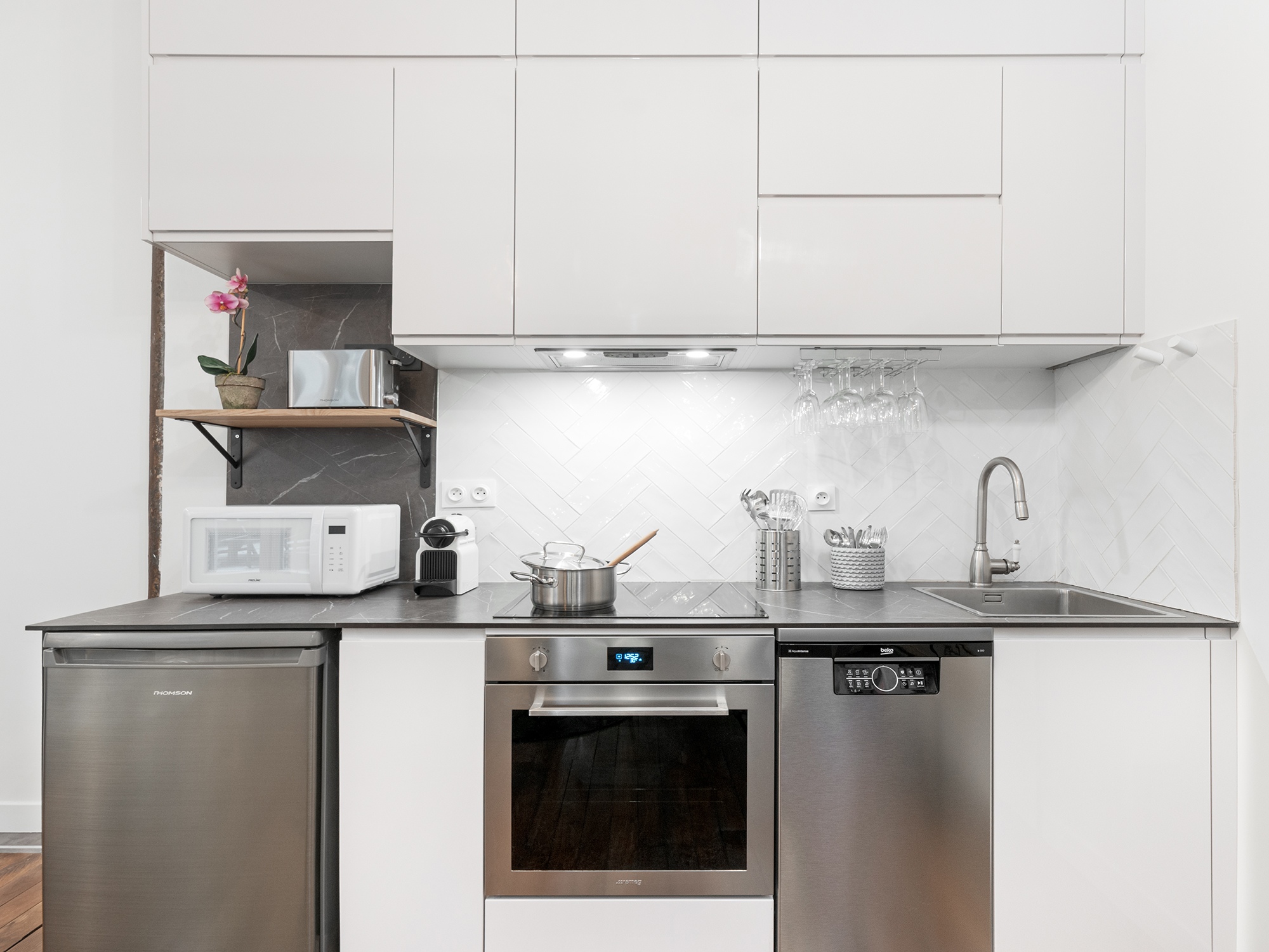 Cet appartement meublé d’environ 45 m2 est situé 5, rue Nicolet, dans le 18èmearrondissement juste en dessous de la Butte Montmartre : Il se trouve en rez-de-chaussée surélevé dans un immeuble parisien typique de bon standing accessible et très sécurisé par une porte avec digicode et un SAS en verre avec Vigic. Ses fenêtres donnent sur un patio intérieur qui peut être utilisé par nos hôtes. Ce patio est équipé d’une table et de chaises. Contemporain et design, l’appartement dispose de : une chambre avec un lit queen size de qualité, d’une chambre avec deux lits et d’un vaste salon avec cuisine US, salle de bain et toilette séparé. Il est équipé d’une télévision écran plat et Internet (accès illimité gratuit), de microonde, four, réfrigérateur, lave-vaisselle, plaques de cuisson, machine NESPRESSO et machine à laver. La salle de bain avec douche et double vasque vous ravira par son design. Les serviettes et draps sont fournis. *Prix sur demande en fonction de la saison et de l’occupation